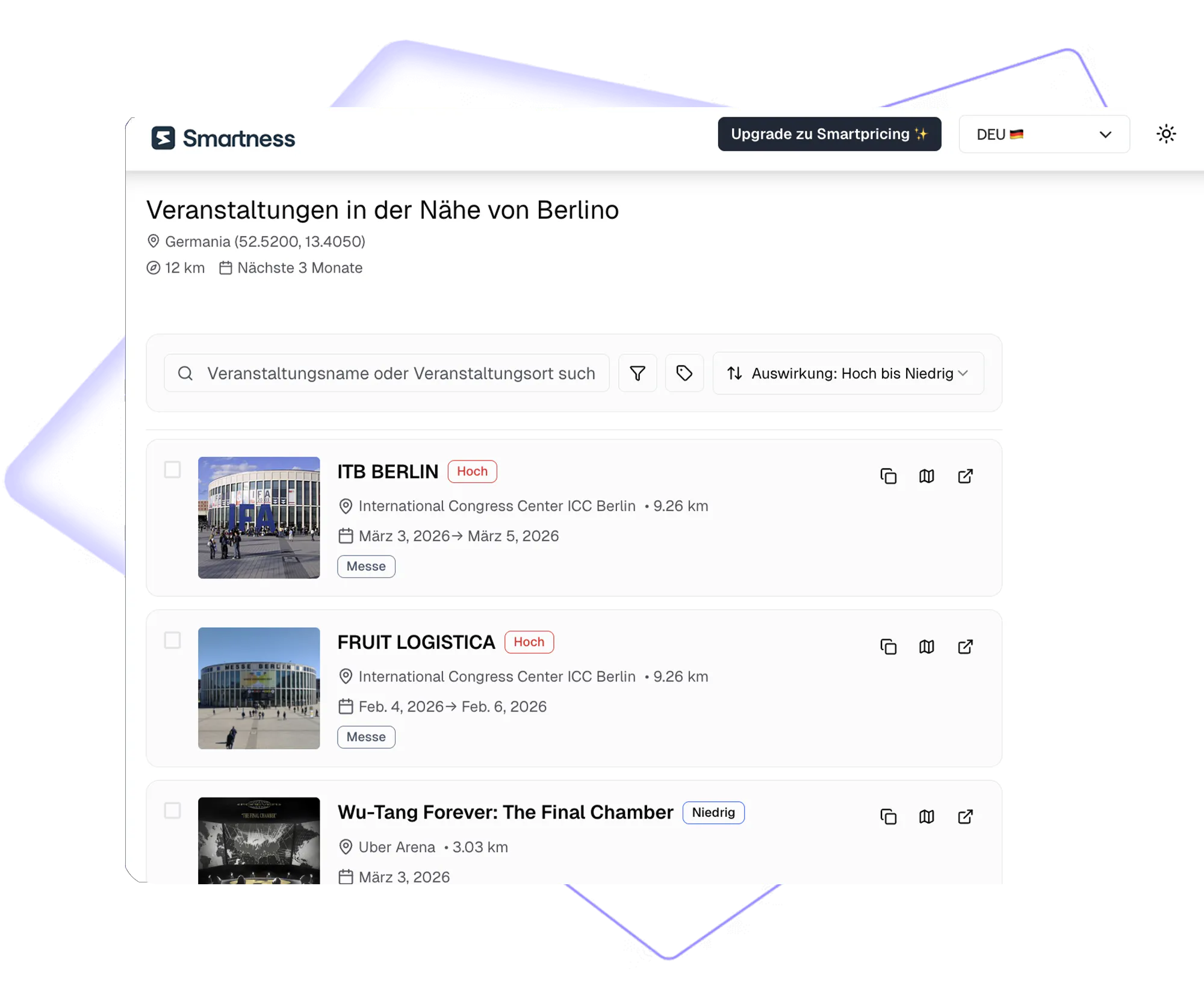 Smartevents ist der schnellste Weg, Events in Ihrer Region zu erfassen und zu erkennen, auf welche Sie setzen sollten, um Ihren Umsatz zu maximieren.