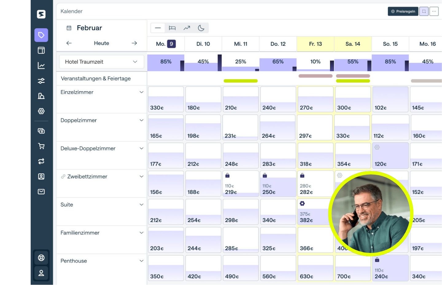 Berücksichtigt Saisonalität, Buchungsfenster und Belegung.